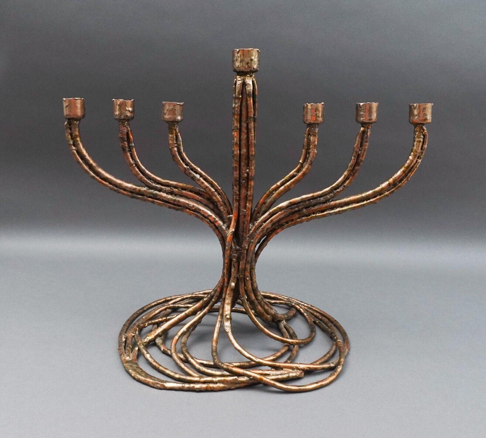 Roy R Butler Signed 1988 Brutalist Copper Judaica Hanukkah Menorah Sculpture 14"