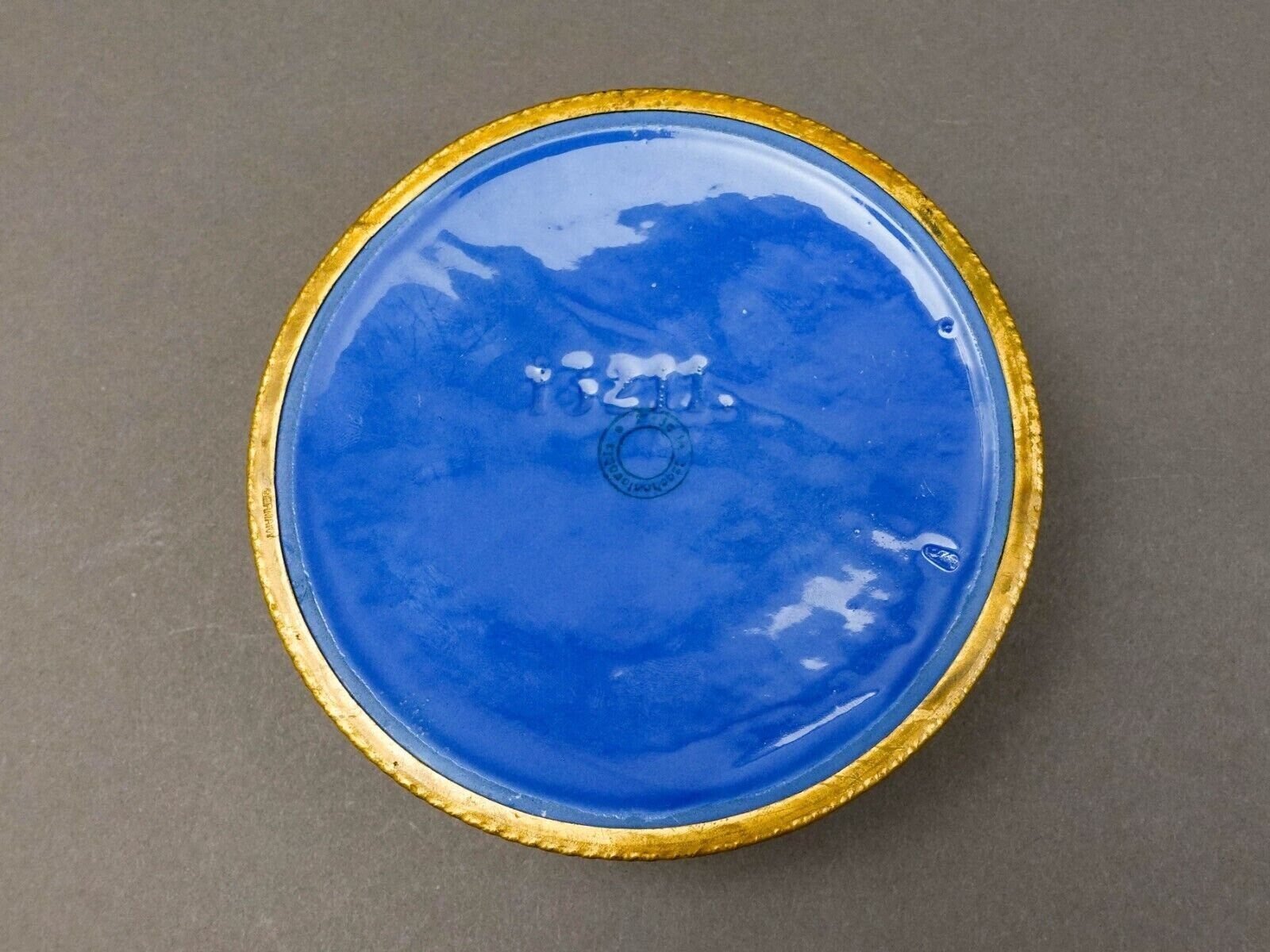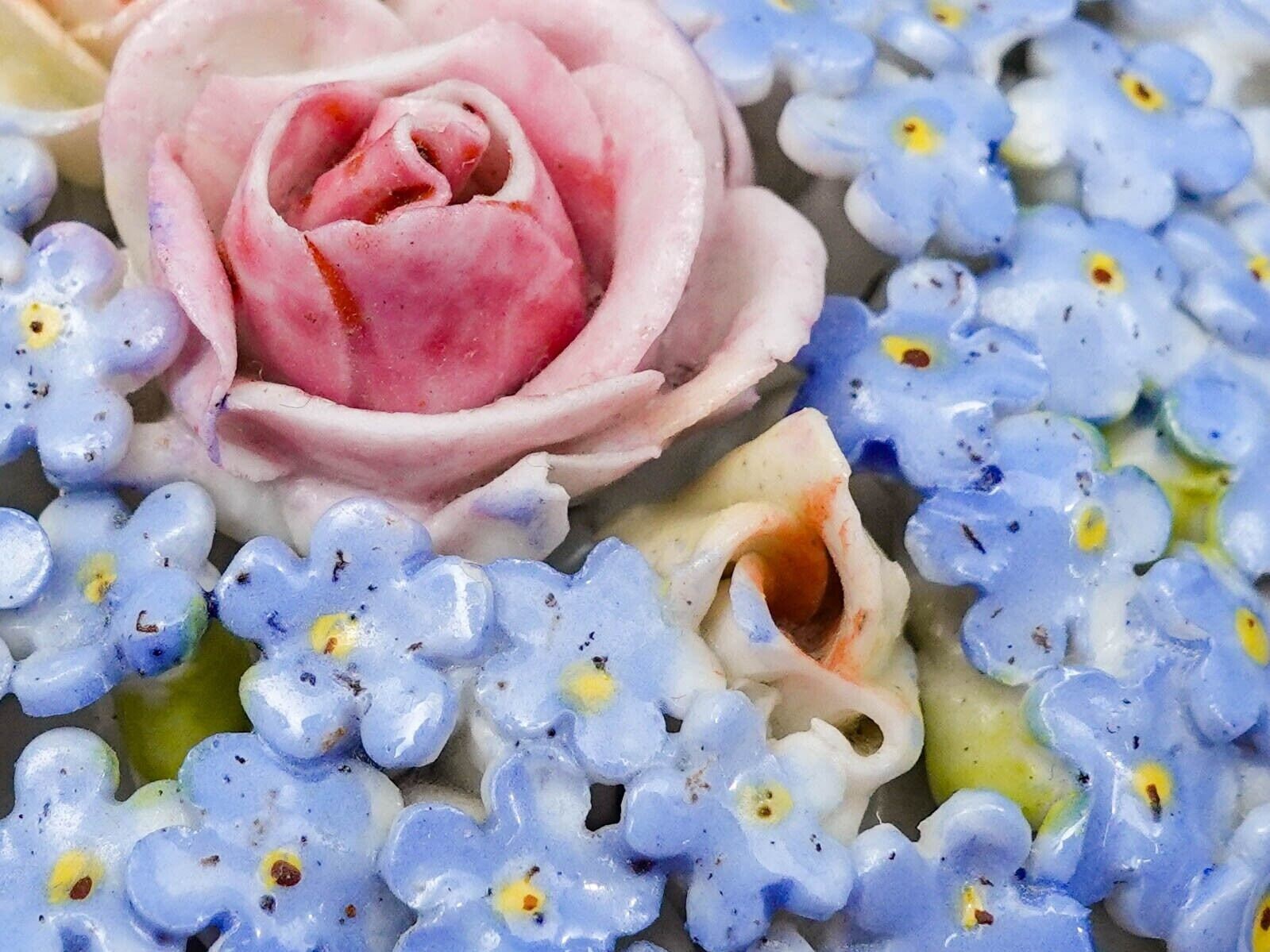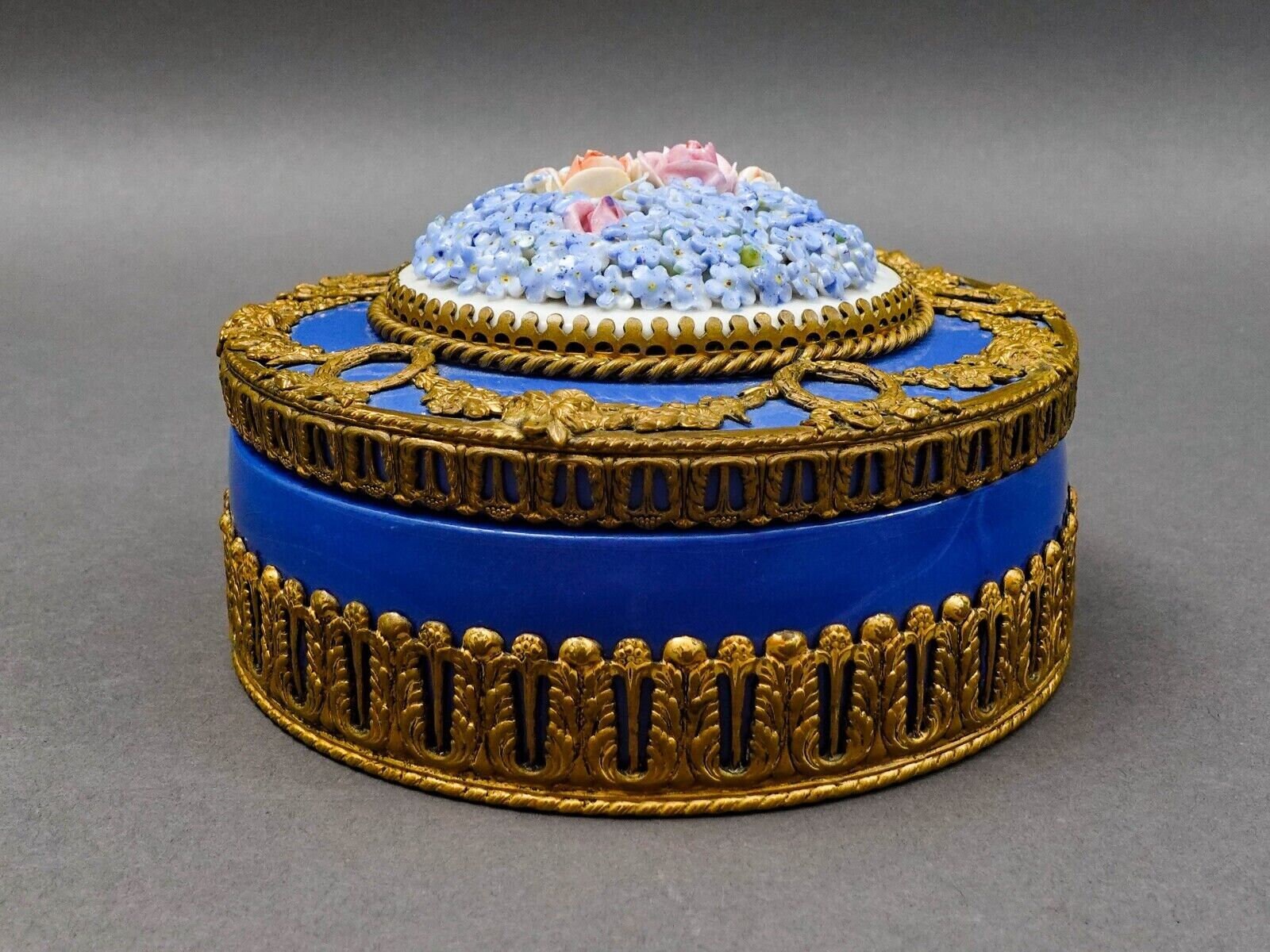 Trinket Jewlery Dresser Vanity Box.Measures approximately 5 1/2" diameter, 3 1/4" high.Great pre-owned condition. Item is being sold as found. No chips, cracks or repairs. Some minimal normal crazing and one petal is boken can't tell, only under inspection. Overall fantastic appearance!!!