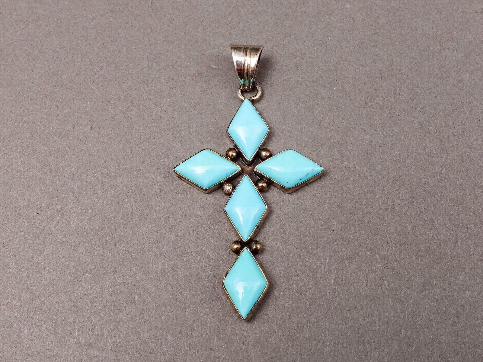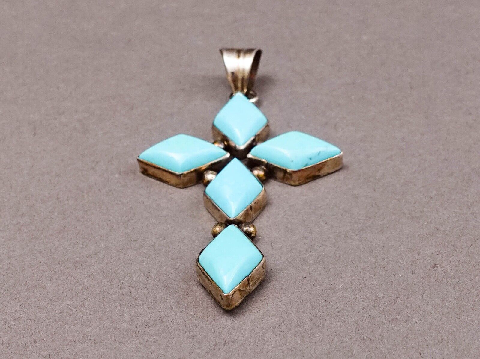 Running Bear RB Signed Navajo Sterling Silver 925 Turquoise Cross Pendant.