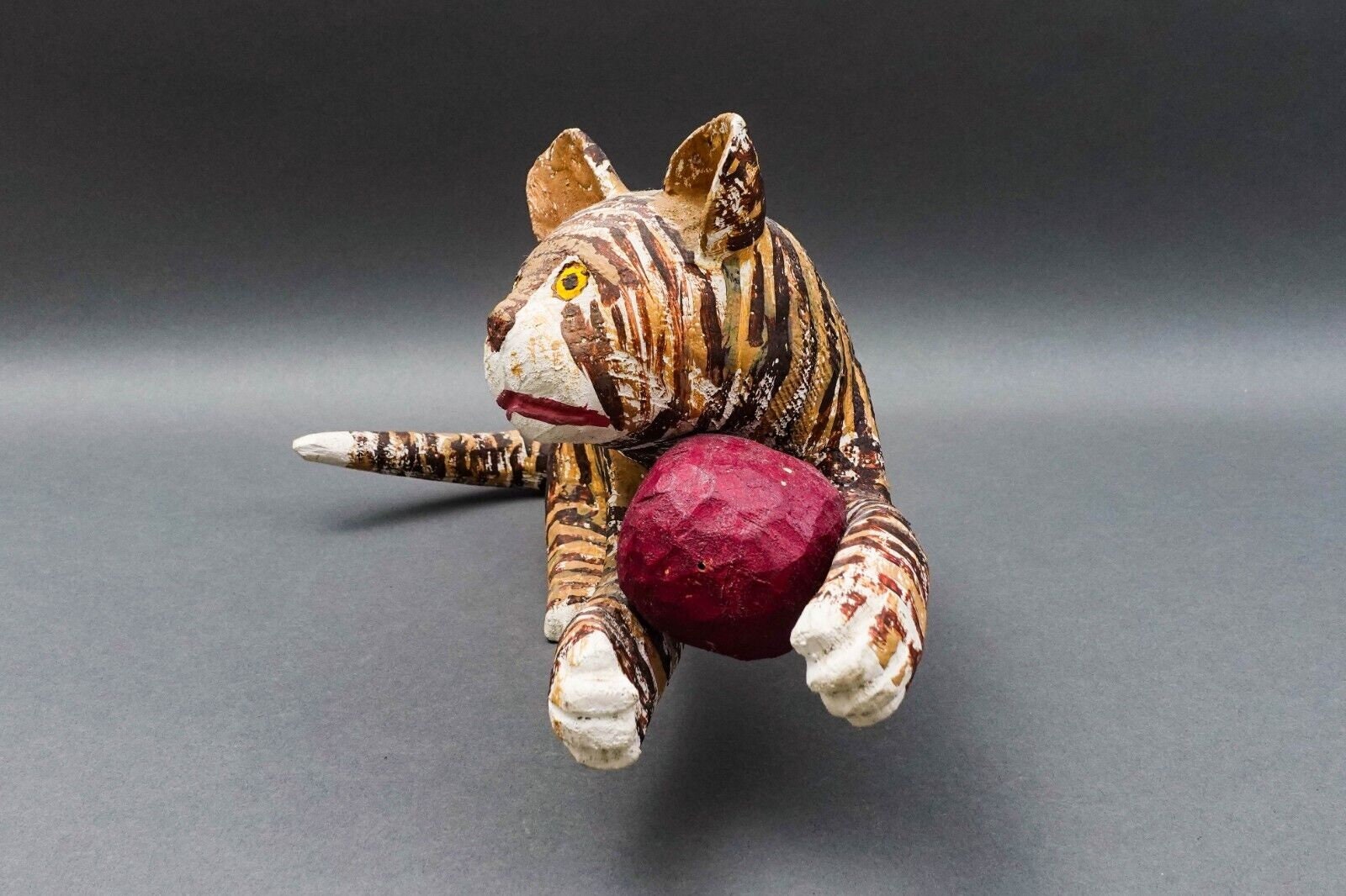 Saturnino Portuound (Pucho) Odio Cat With Ball Painted Carved Wood Sculpture.
