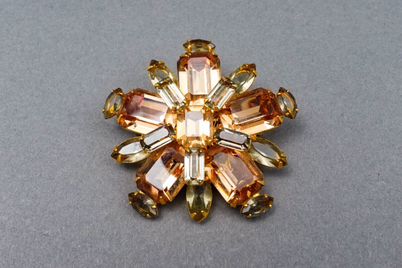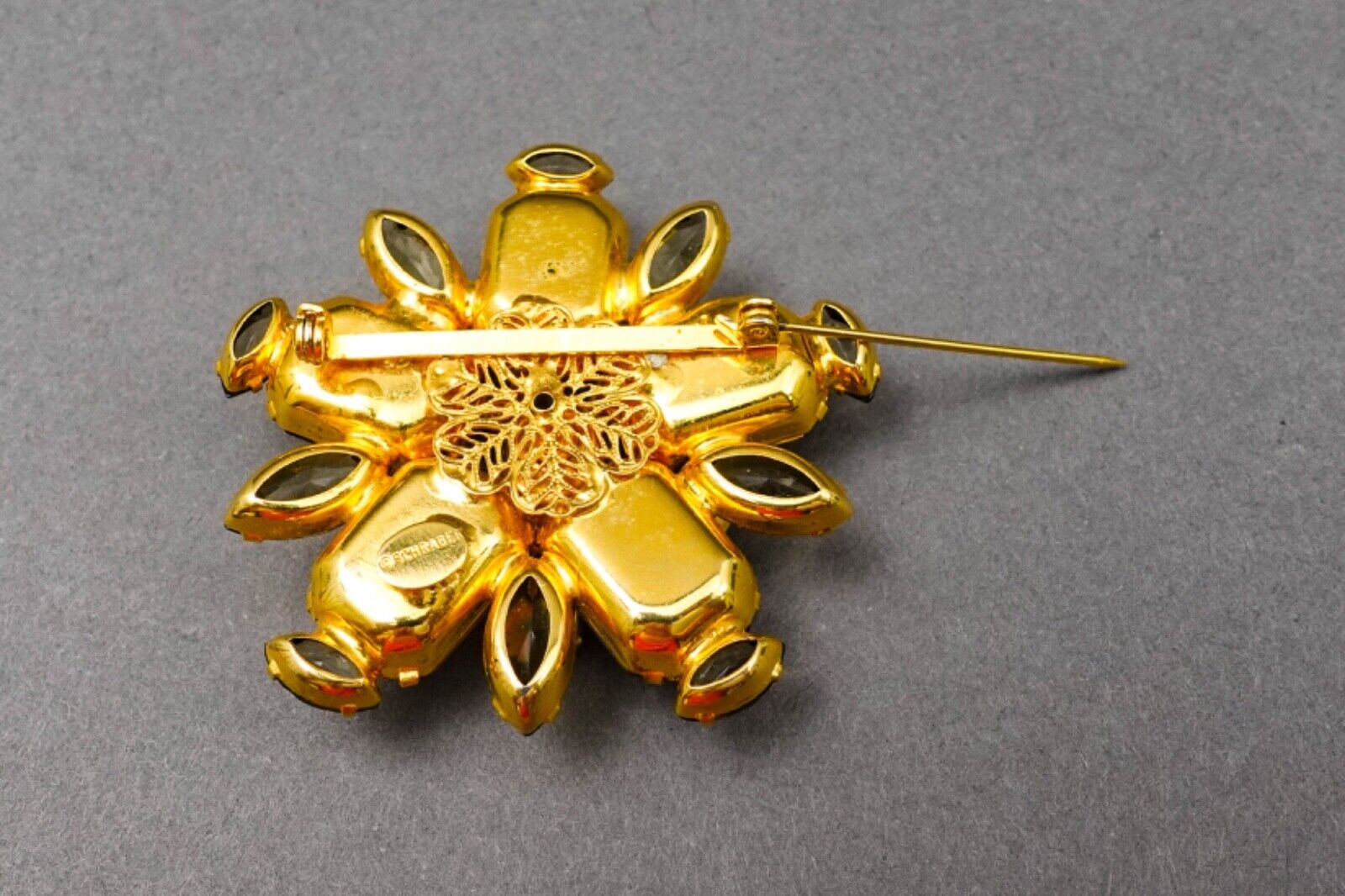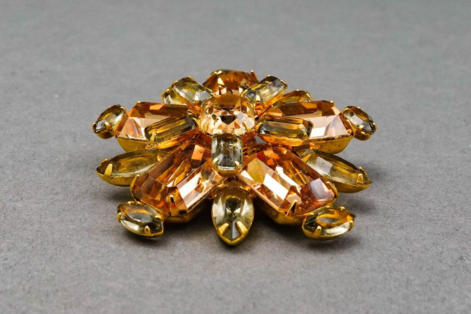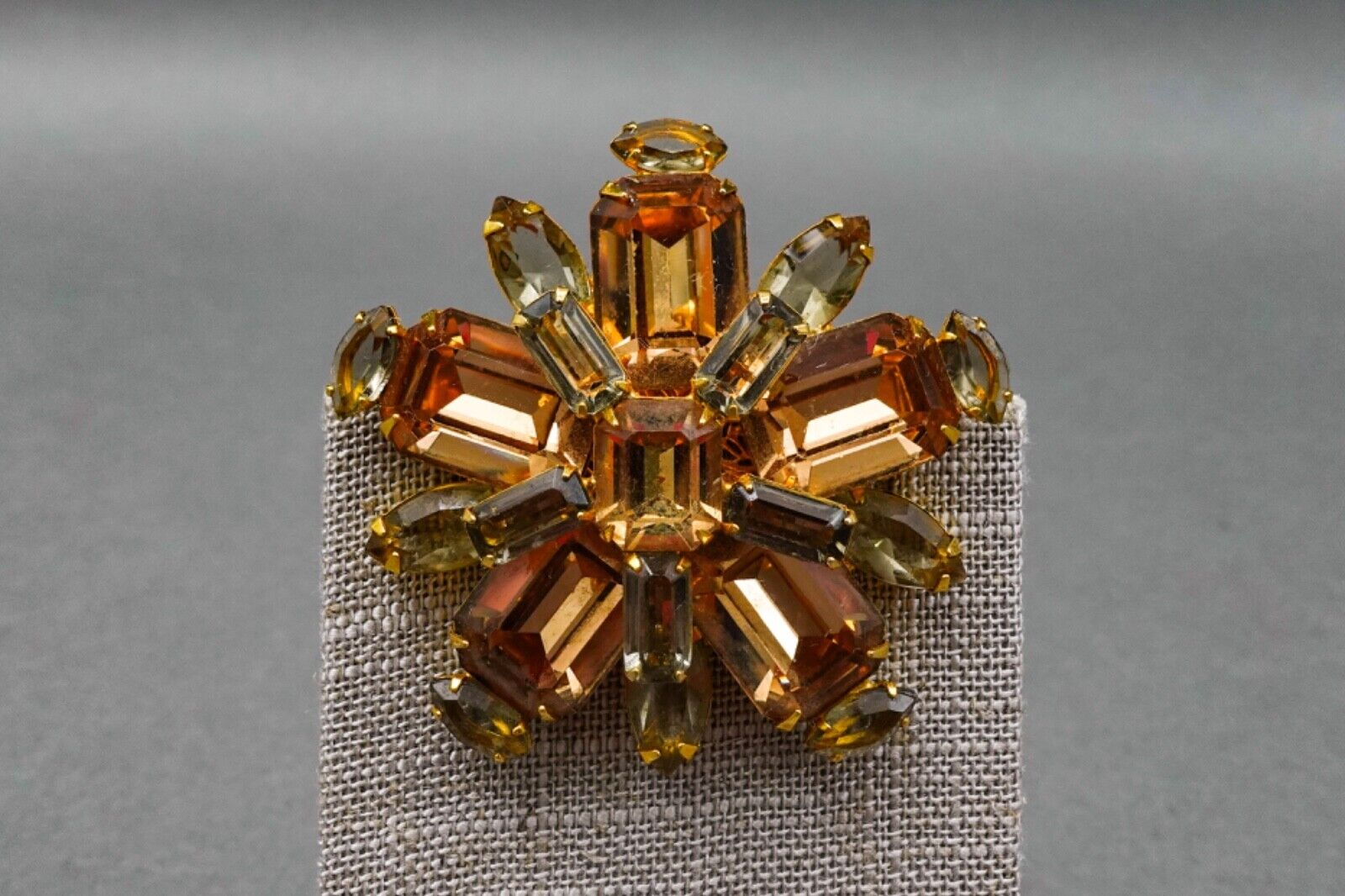 Schrager Signed Vintage Starburst Gold Tone Amber Rhinestone Brooch Pin