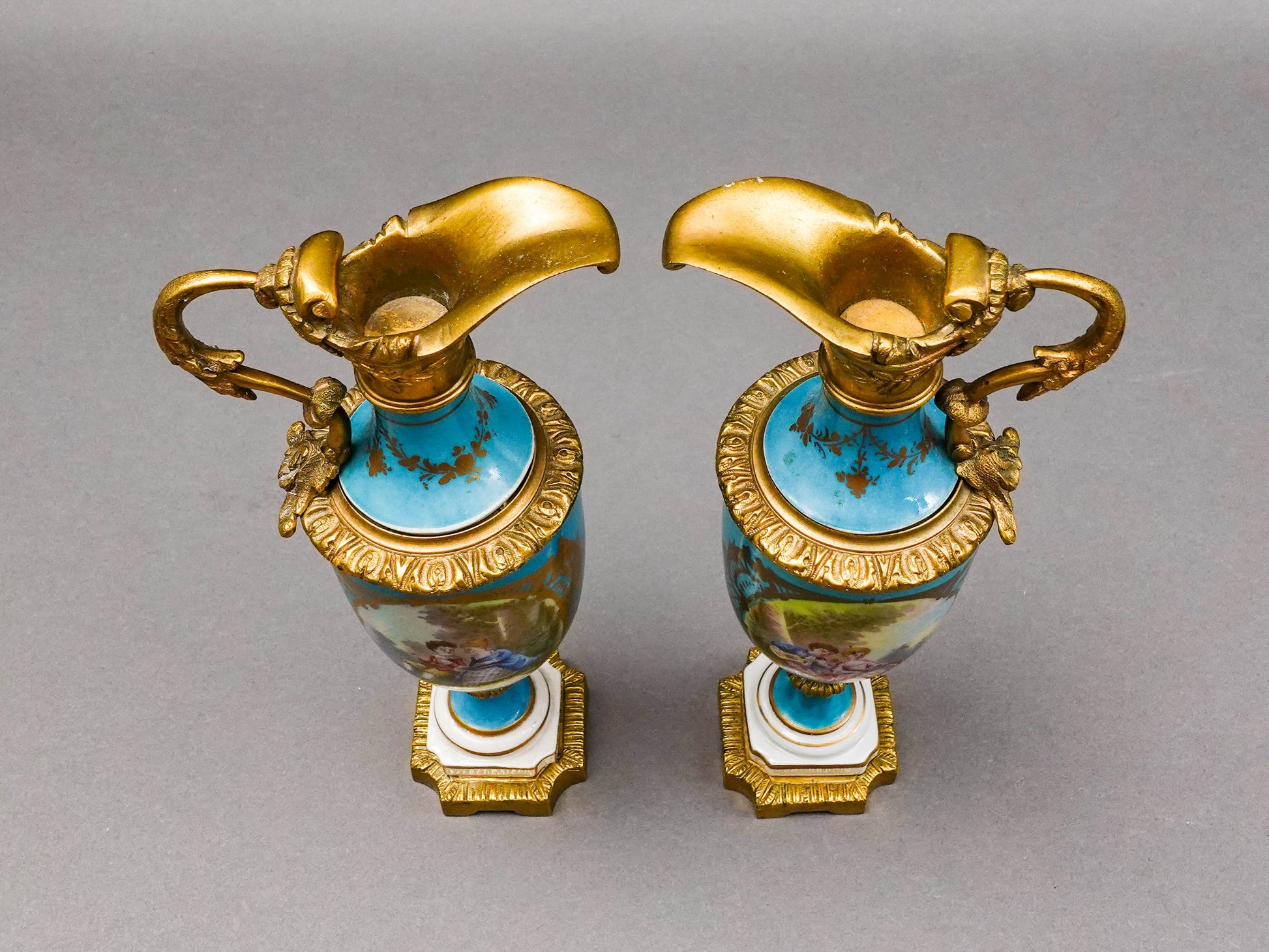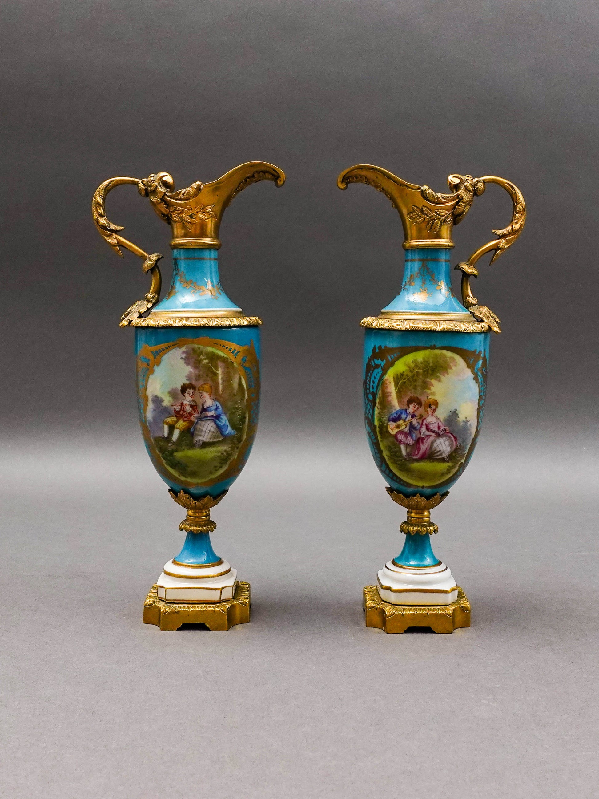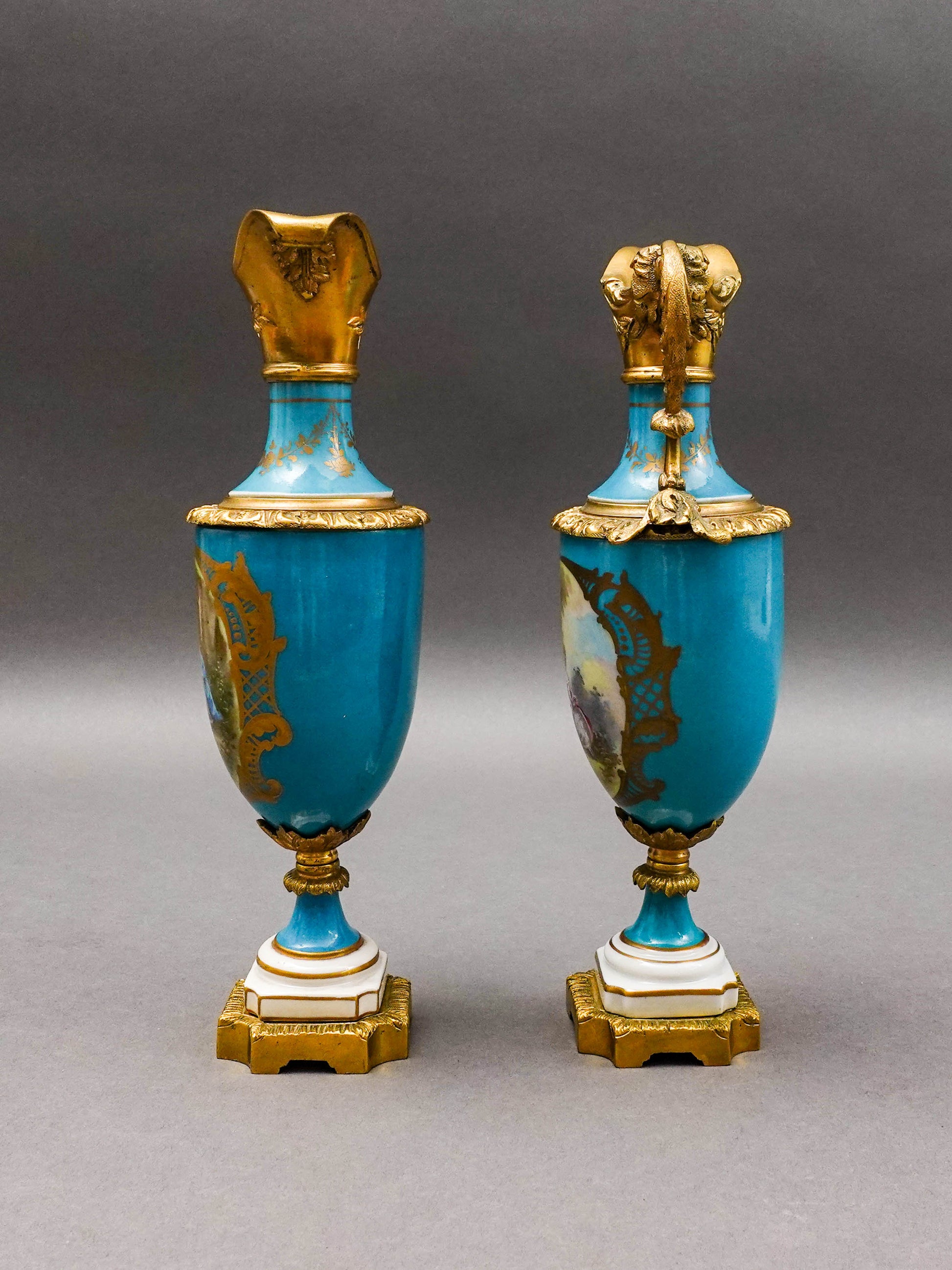 Sevres Style Antique Gold Gilt Bronze Mounted Turquoise Porcelain Ewer Jug Pair