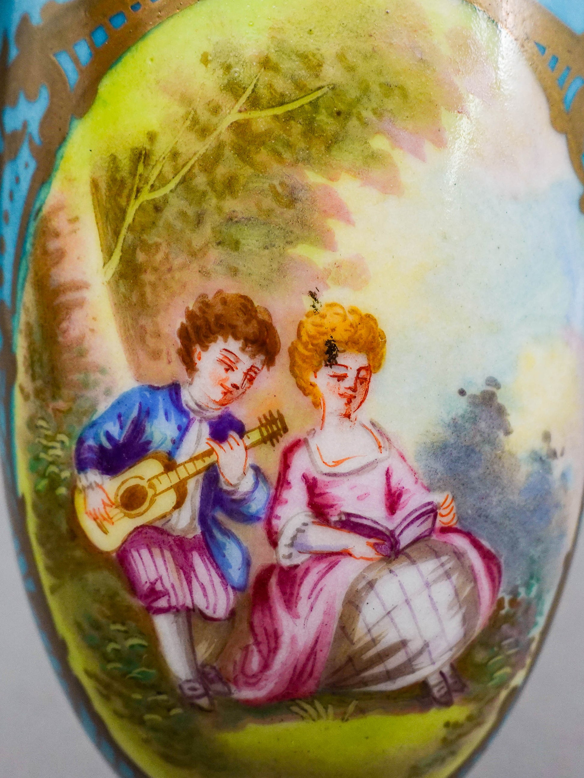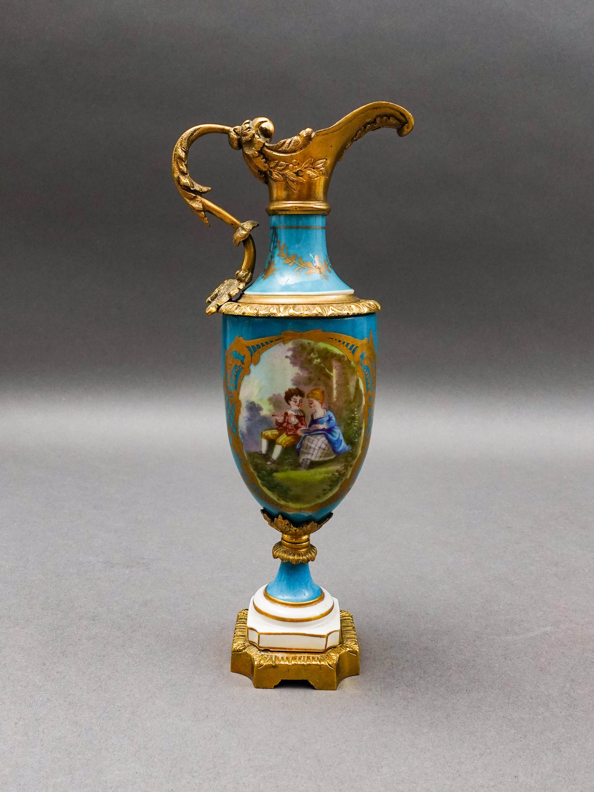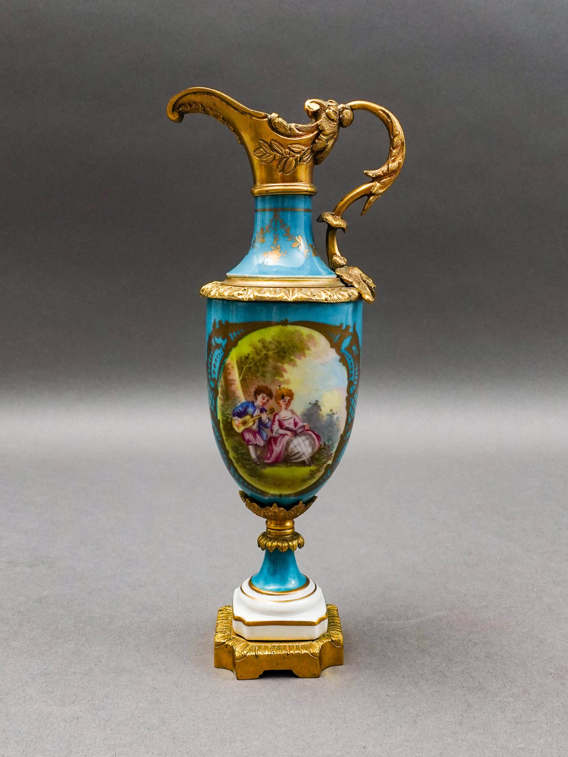 Sevres Style Antique Gold Gilt Bronze Mounted Turquoise Porcelain Ewer Jug Pair