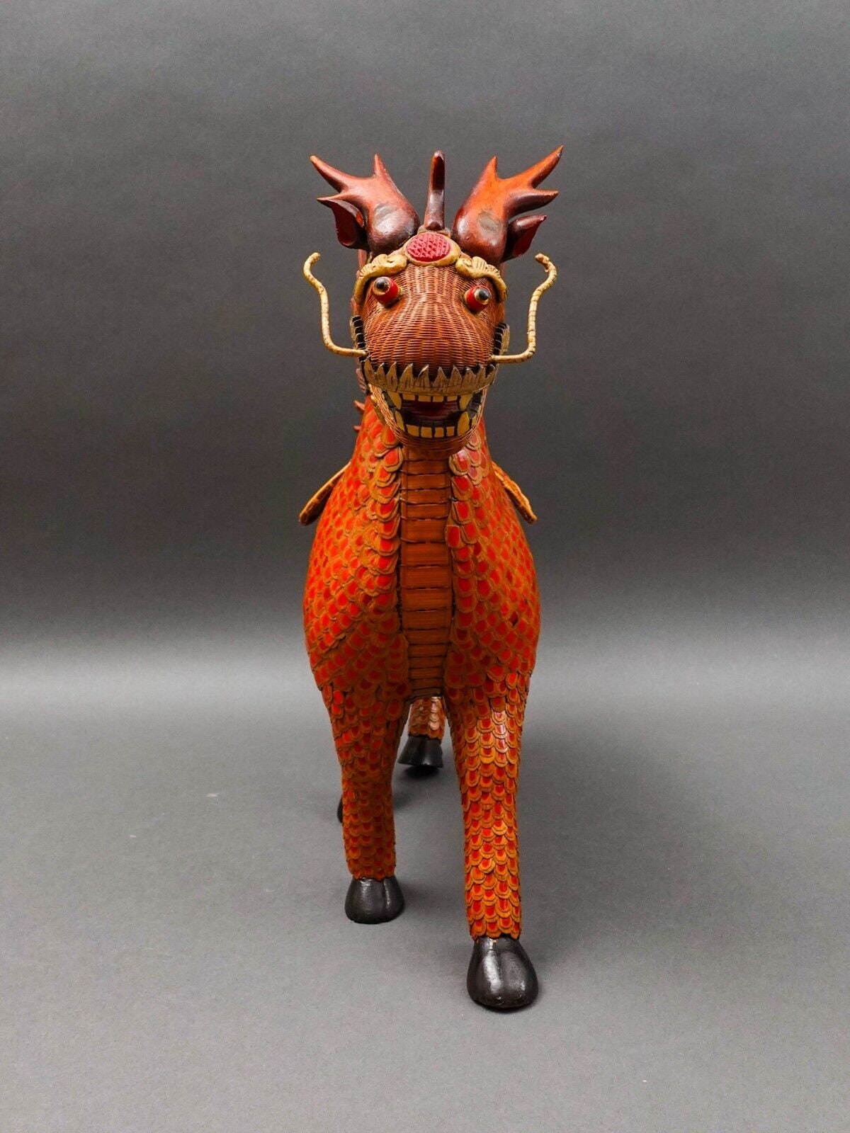 Shanghai Handicrafts Vintage Lacquer Wicker Bamboo Longma Dragon Basket (Read)