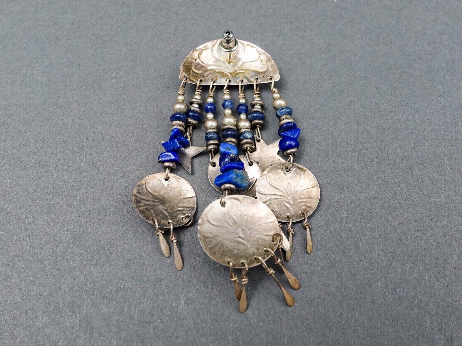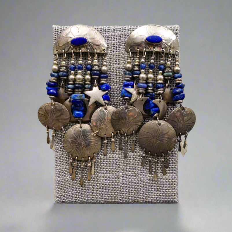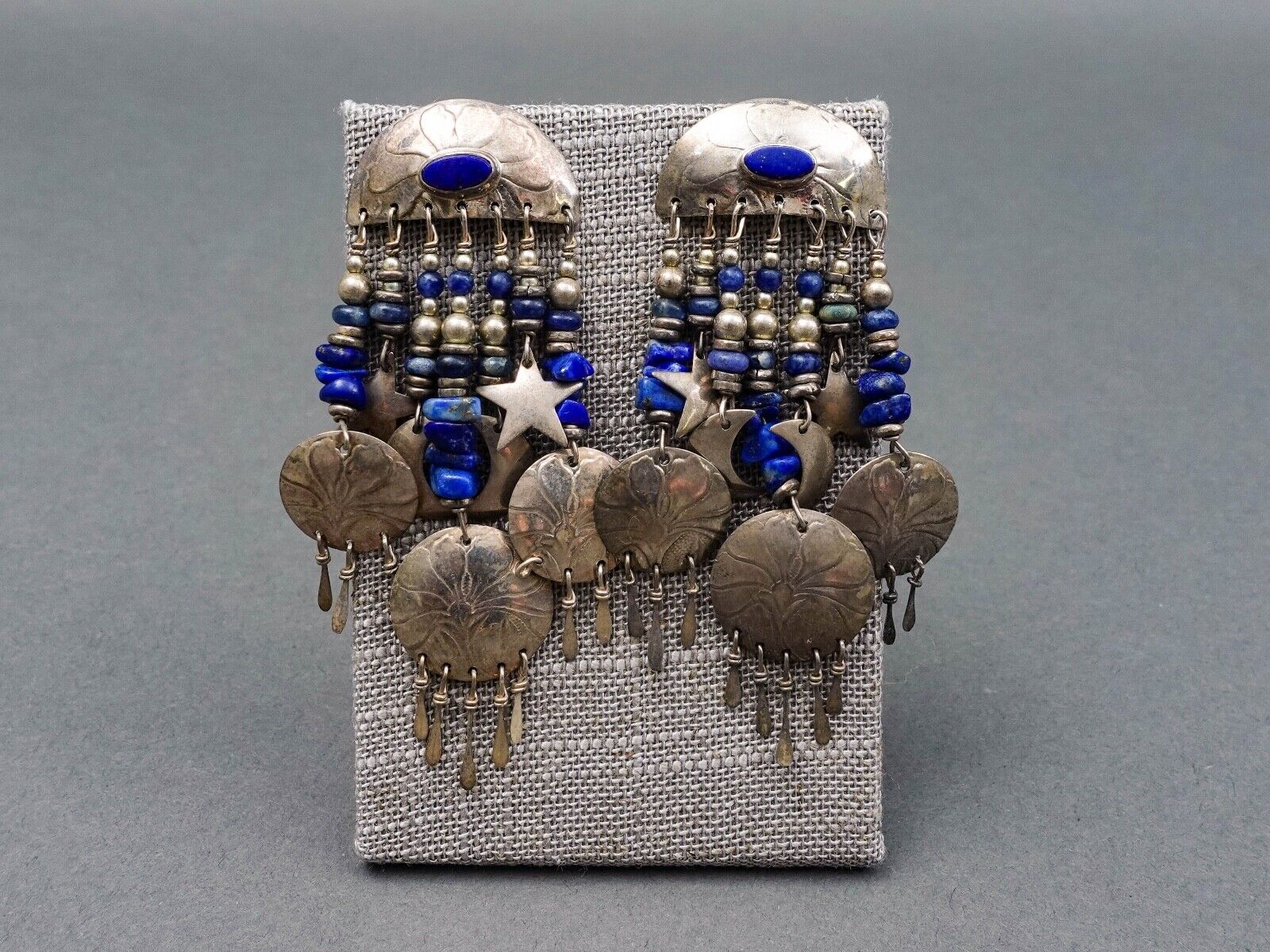 Tabra Signed Vintage Sterling Silver Lapis Lazuli Lotus Star Moon Tribal Dangle