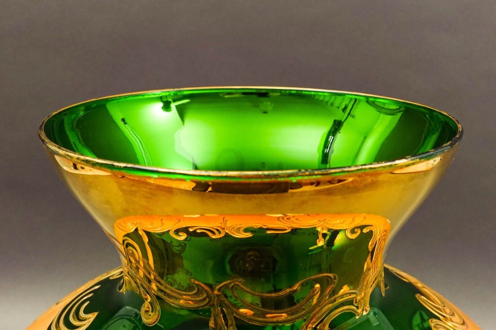 Tre Fuochi Italian Venetian Murano Glass Bohemian Emerald Green 24K Gold Floral Vase.