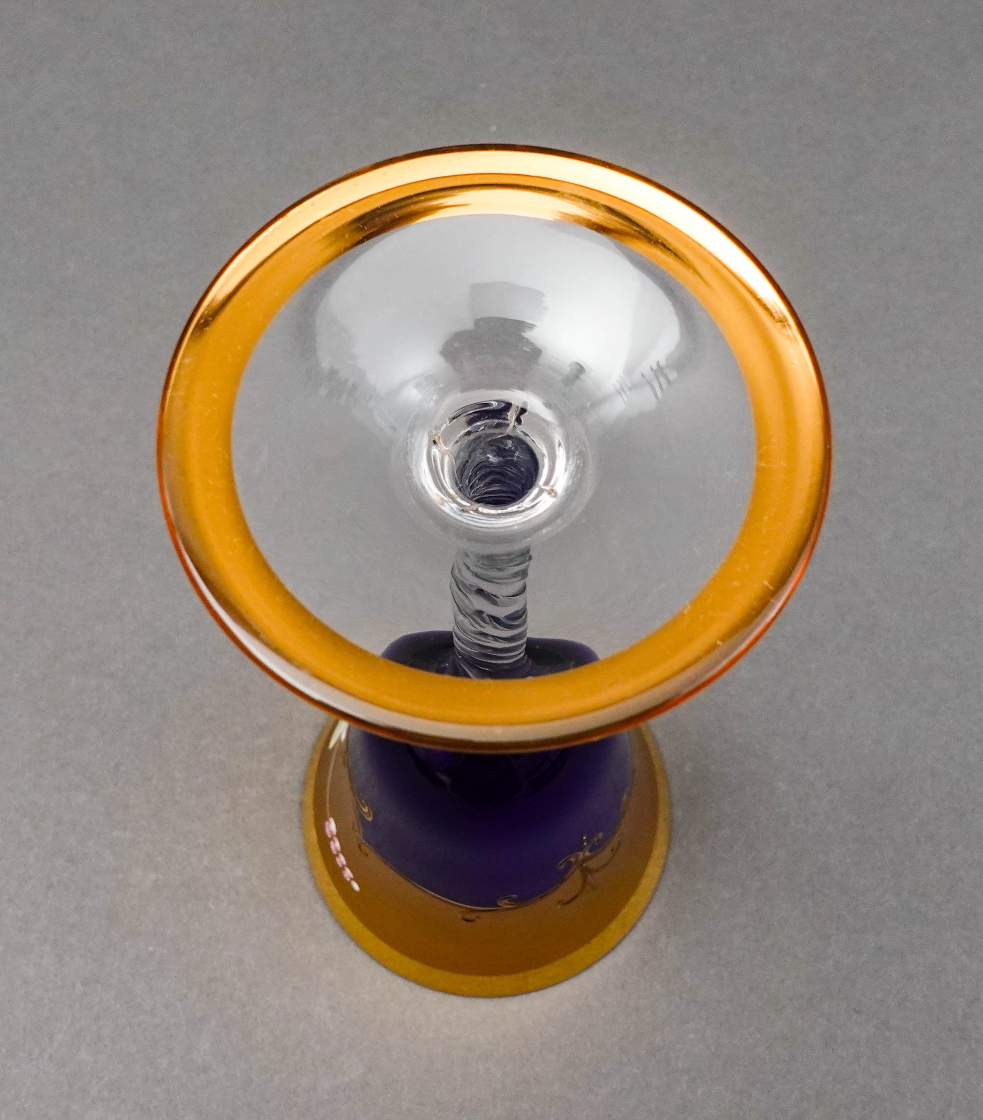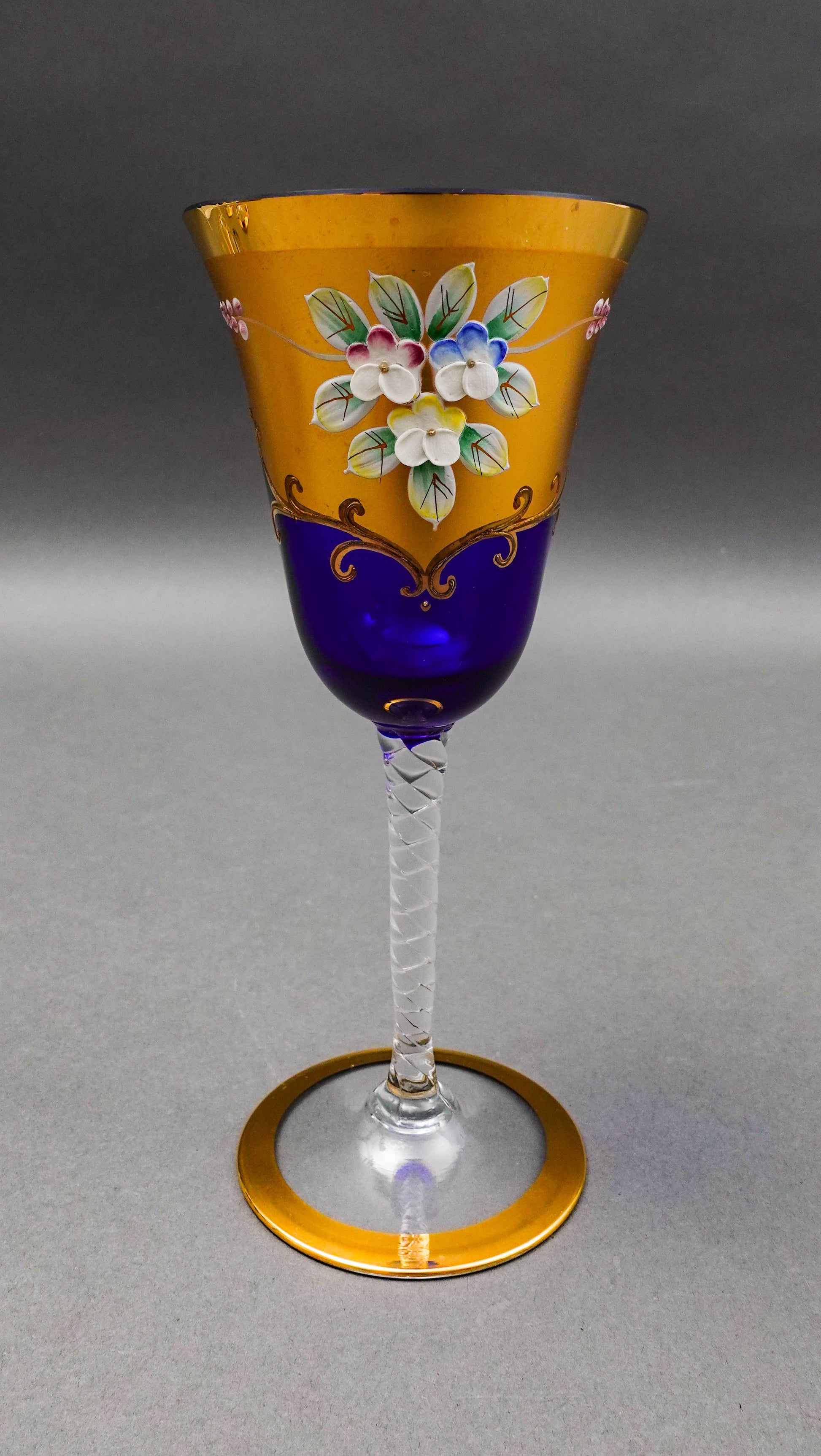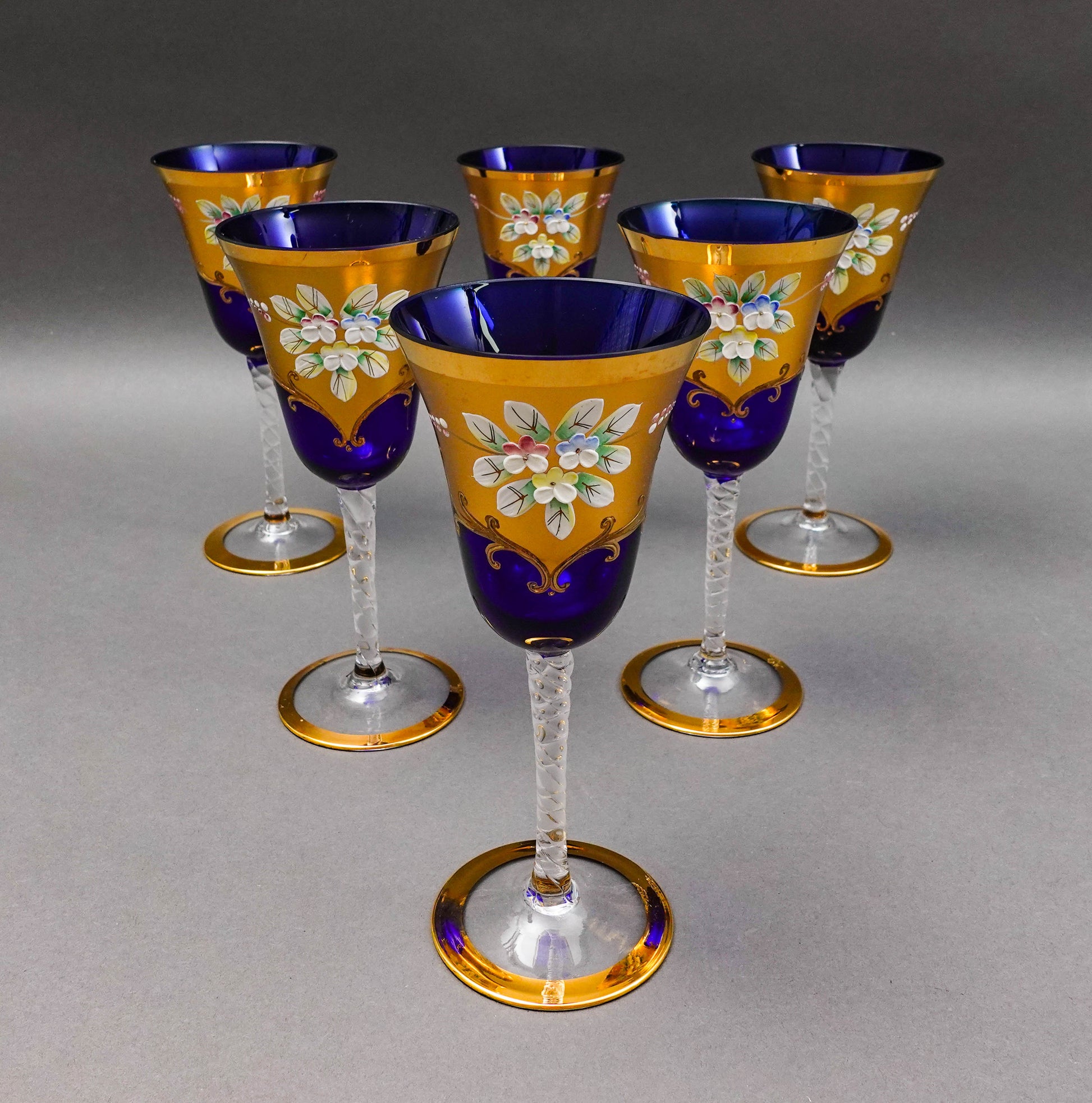 Tre Fuochi Venetian Murano Glass Cobalt Blue 24K Gold Floral Wine Glasses Set Of 6.