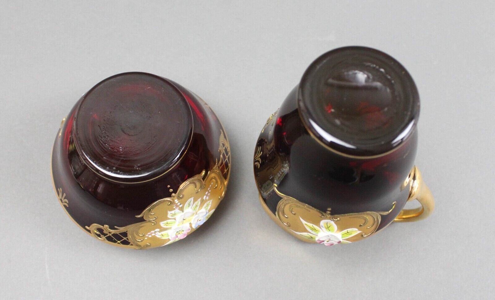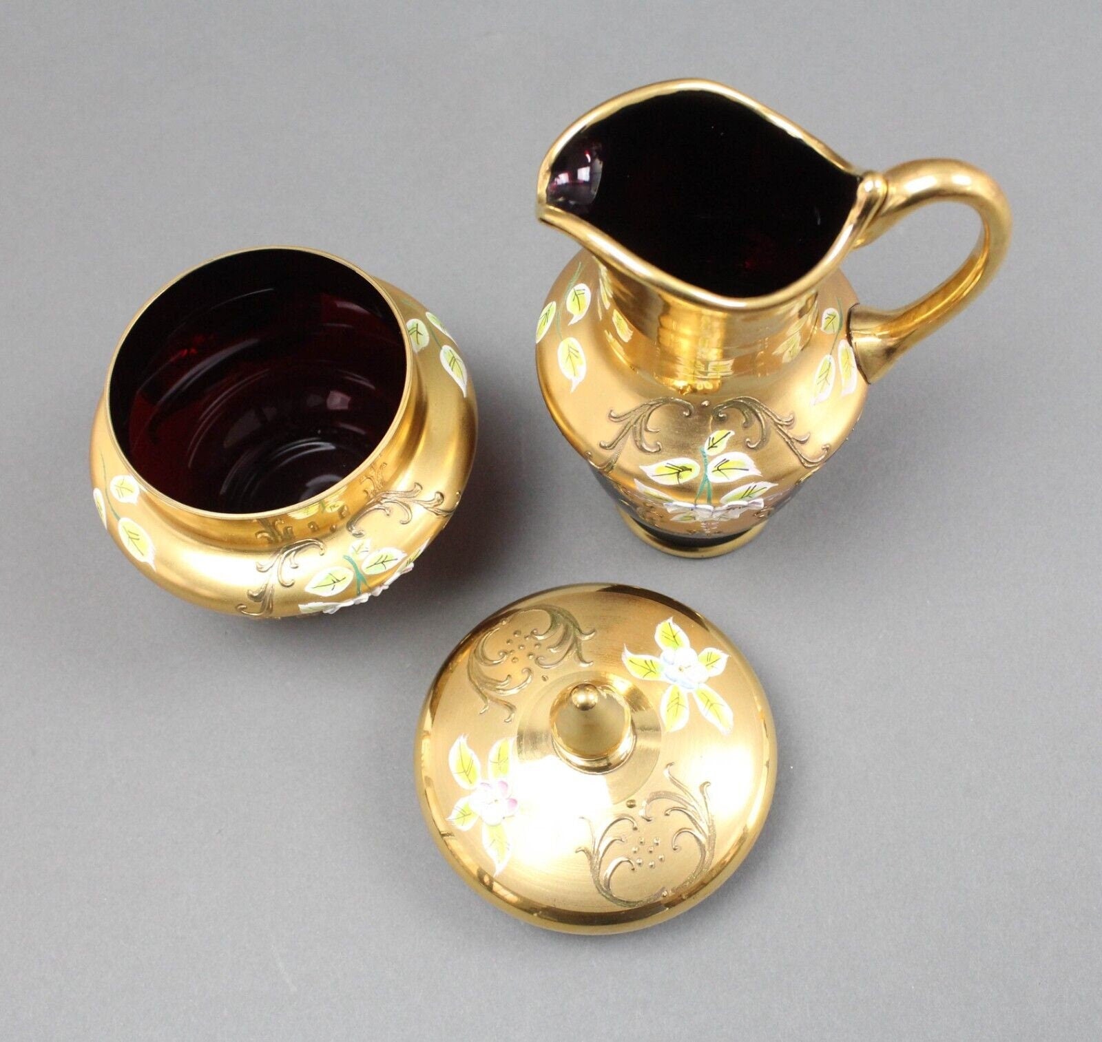 Bohemian Ruby Red Hand Painted 24K Gold & Enamel Floral Creamer & Sugar Set. Measures approximately Creamer: 4 3/8" long, 2 3/4" wide, 6 1/4" high. Sugar Bowl measures 3 3/4" diameter, 5 3/4" high.Excellent pre-owned condition. Item is being sold as found. No chips, cracks or repairs. Overall fantastic appearance!!!