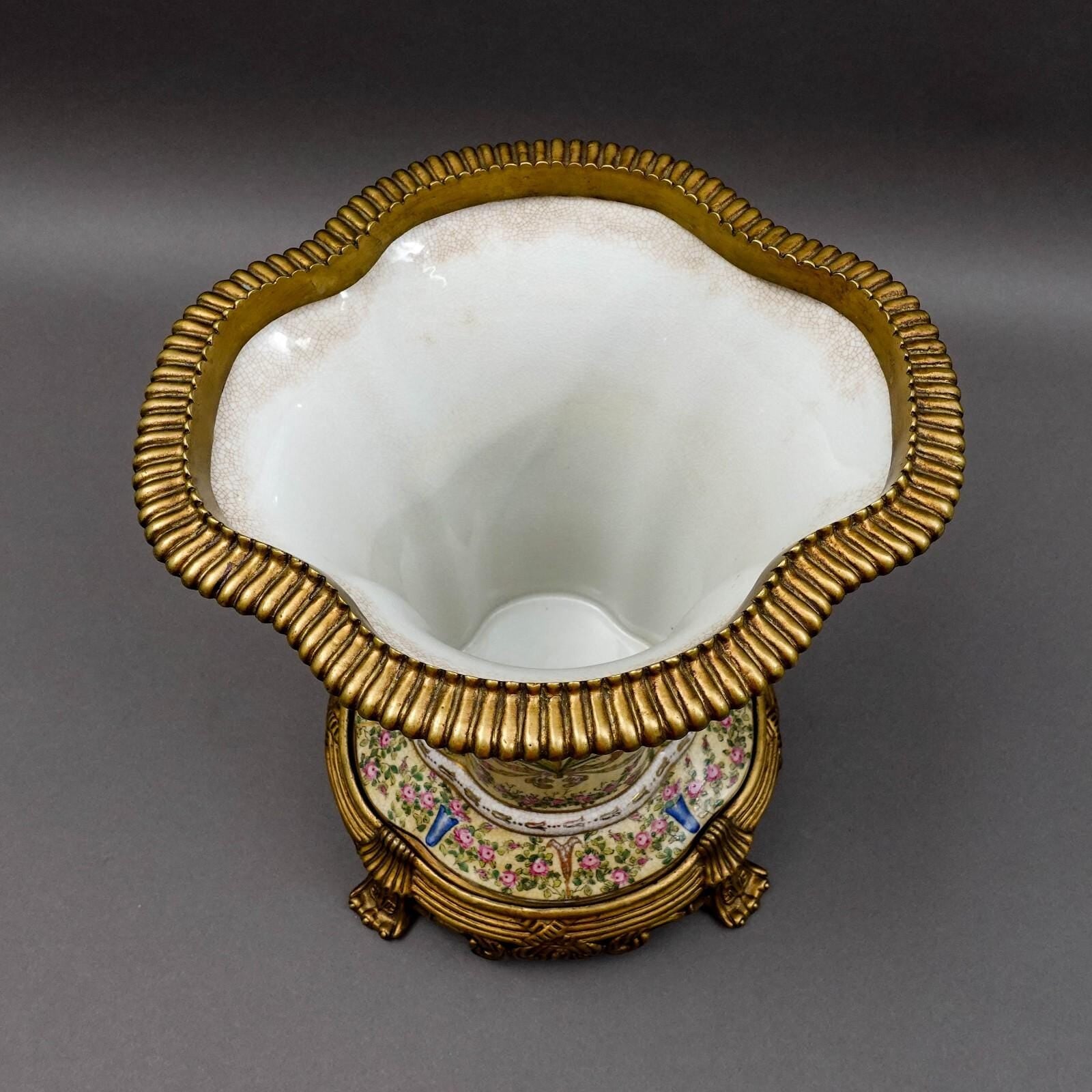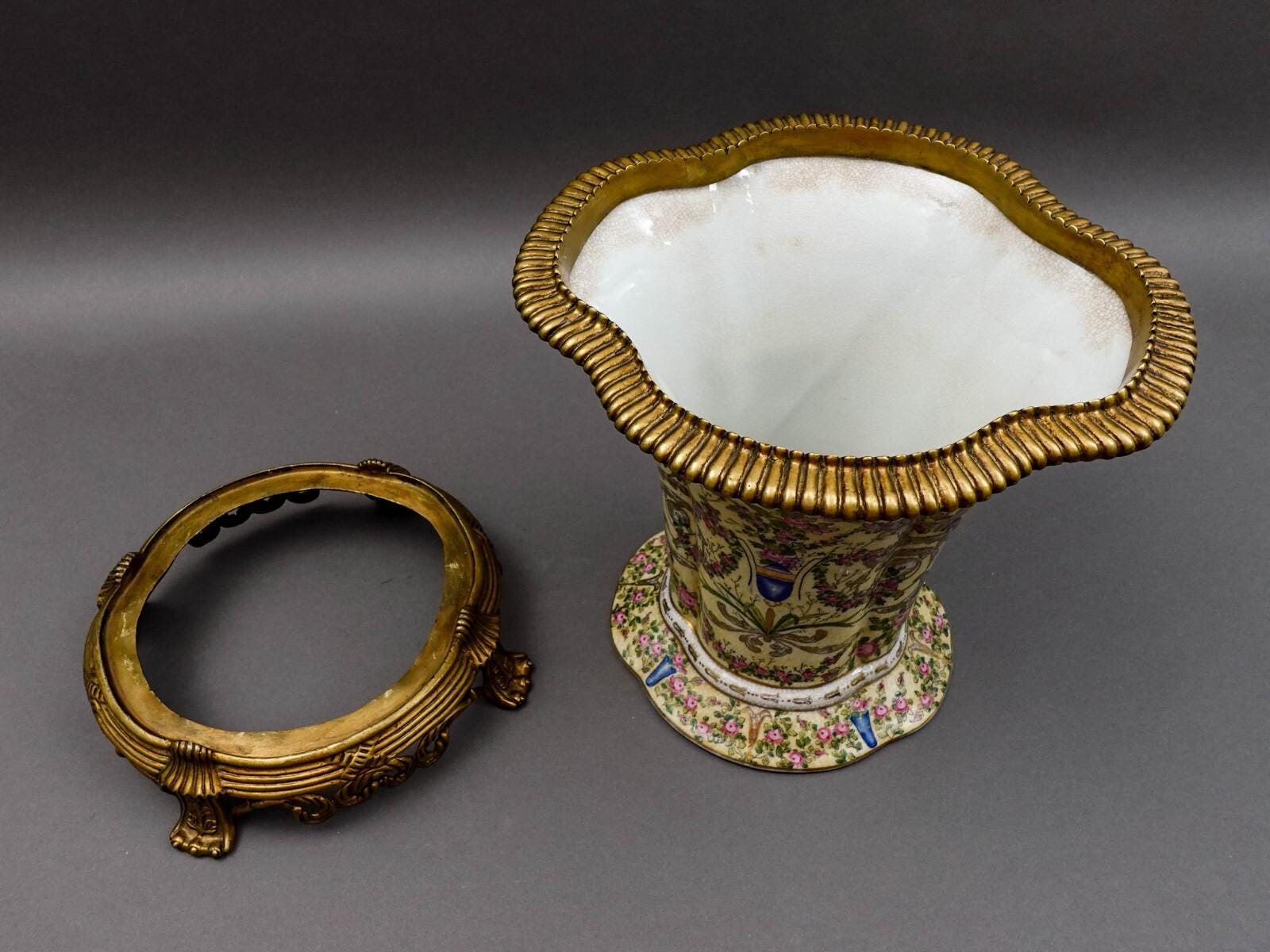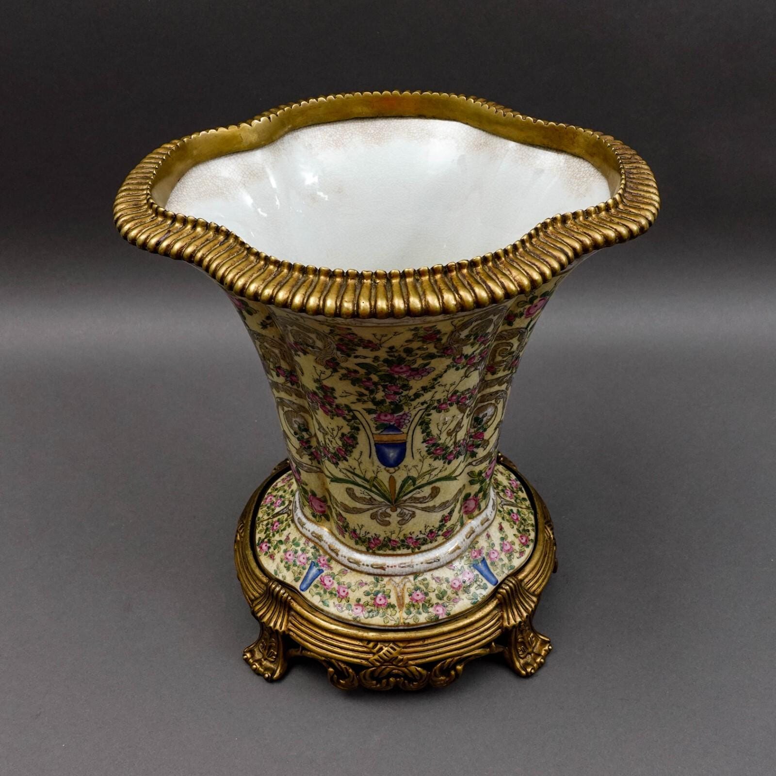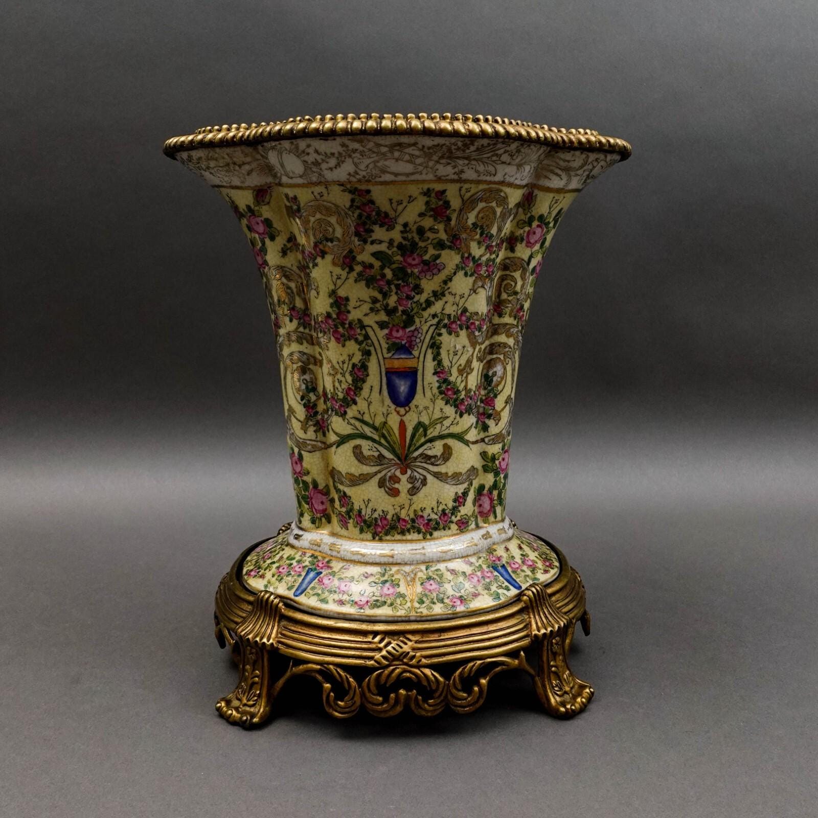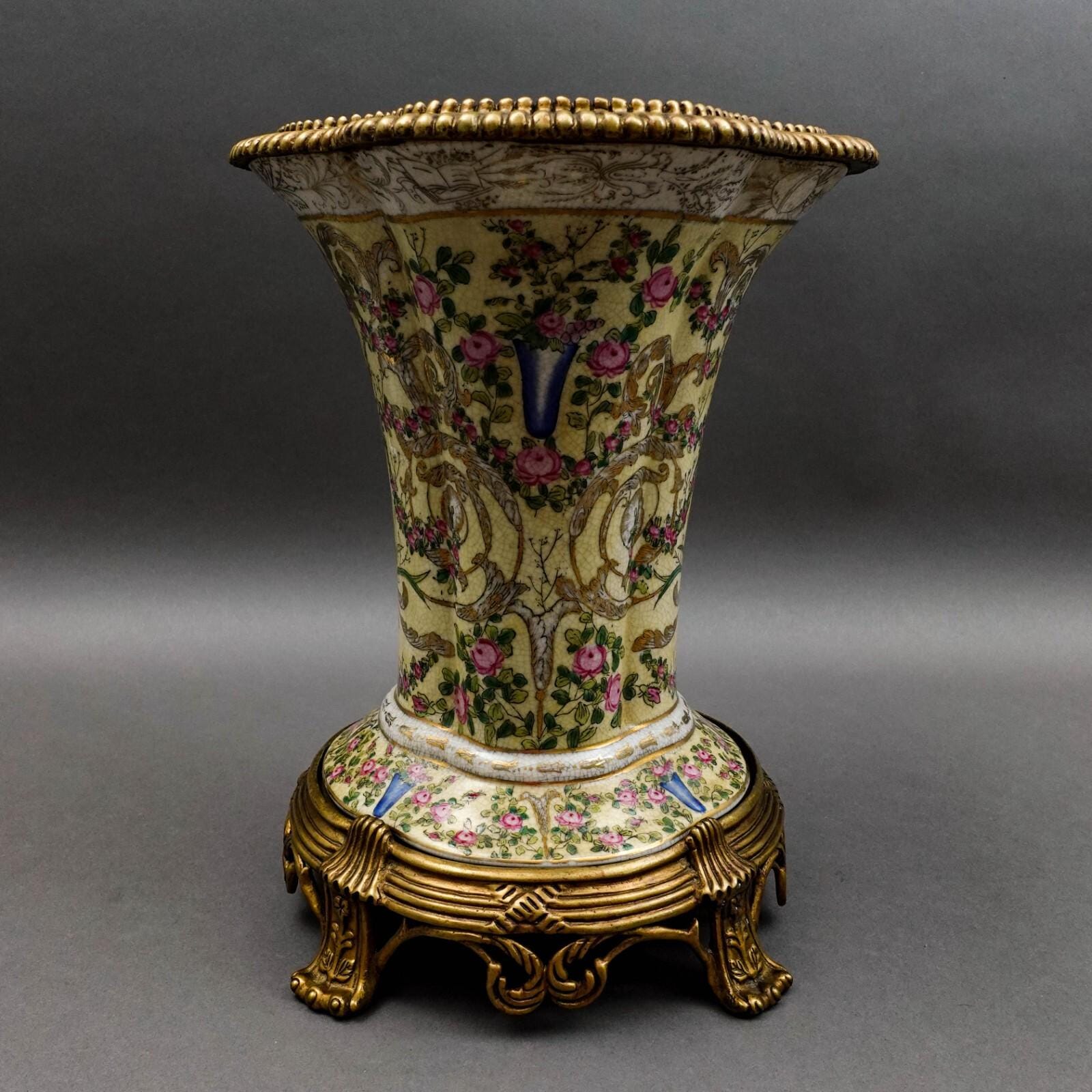 United Wilson UW 1897 Crackle Hand Painted Floral Bronze & Porcelain Vase 12.75"