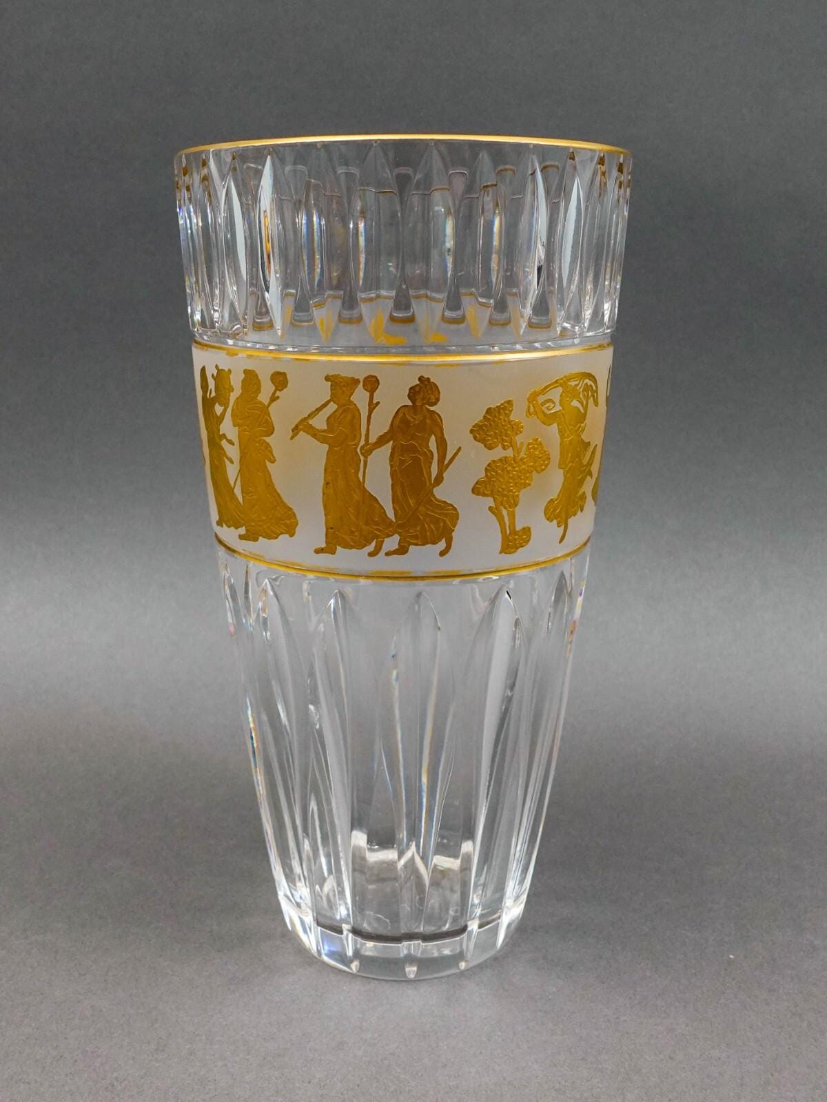 Val St Lambert Signed Danse De Flore Gold Gilt Cut Crystal Vase.Measures approximately 4 1/4" diameter, 9" high.Excellent pre-owned condition. Item is being sold as found. No chips, cracks or