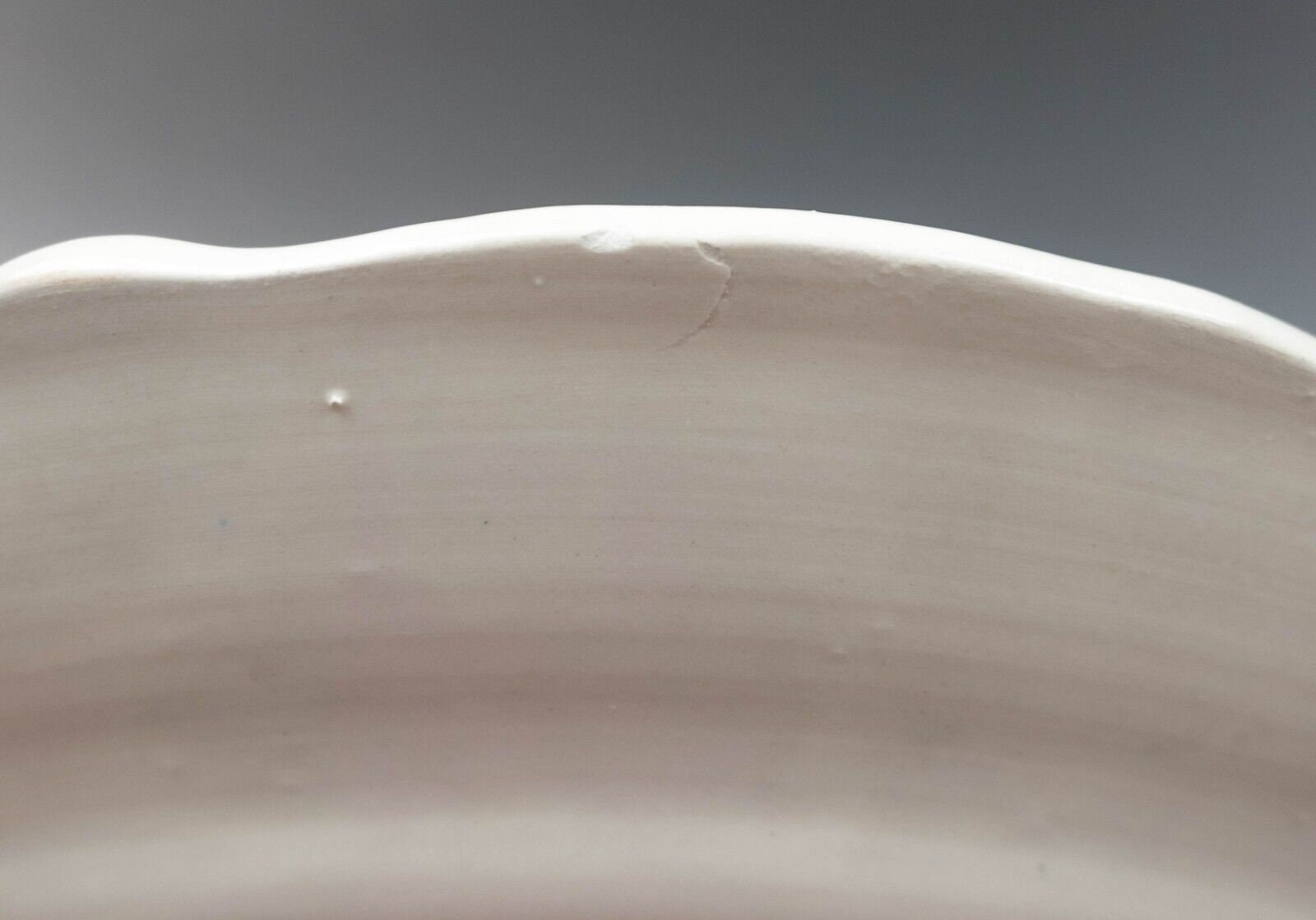 Measures approximately 13 1/2" diameter, 4 7/8" high.Good pre-owned condition. Item is being sold as found. No cracks or repairs. Platter has nick flake and hairline crack to one area in edge, one nick flake to cover and flakes to finial.Overall fantastic appearance!!!