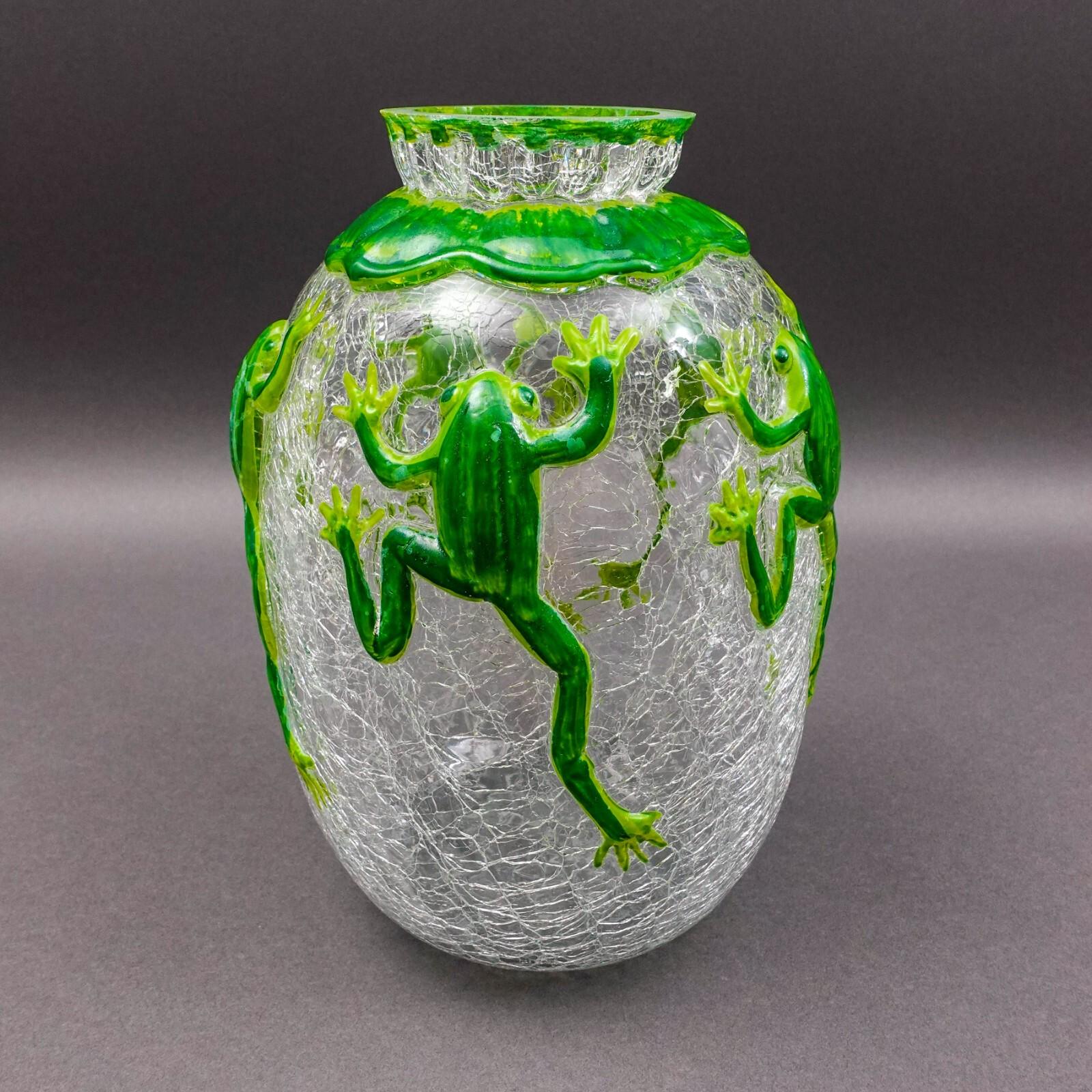Vintage Applied Five Green Frogs In Relief Clear Crackle Glass Vase.Measures approximately 7" diameter, 10 1/8" high.Very good pre-owned condition. Item is being sold as found. No chips, cracks or