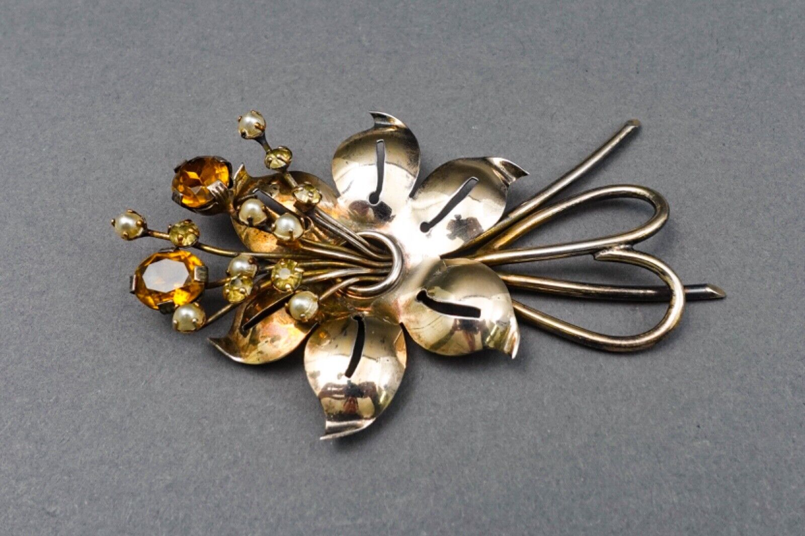 Vintage Large Sterling Silver Faux Pearl Amber Rhinestone Bouquet Brooch Pin 4"