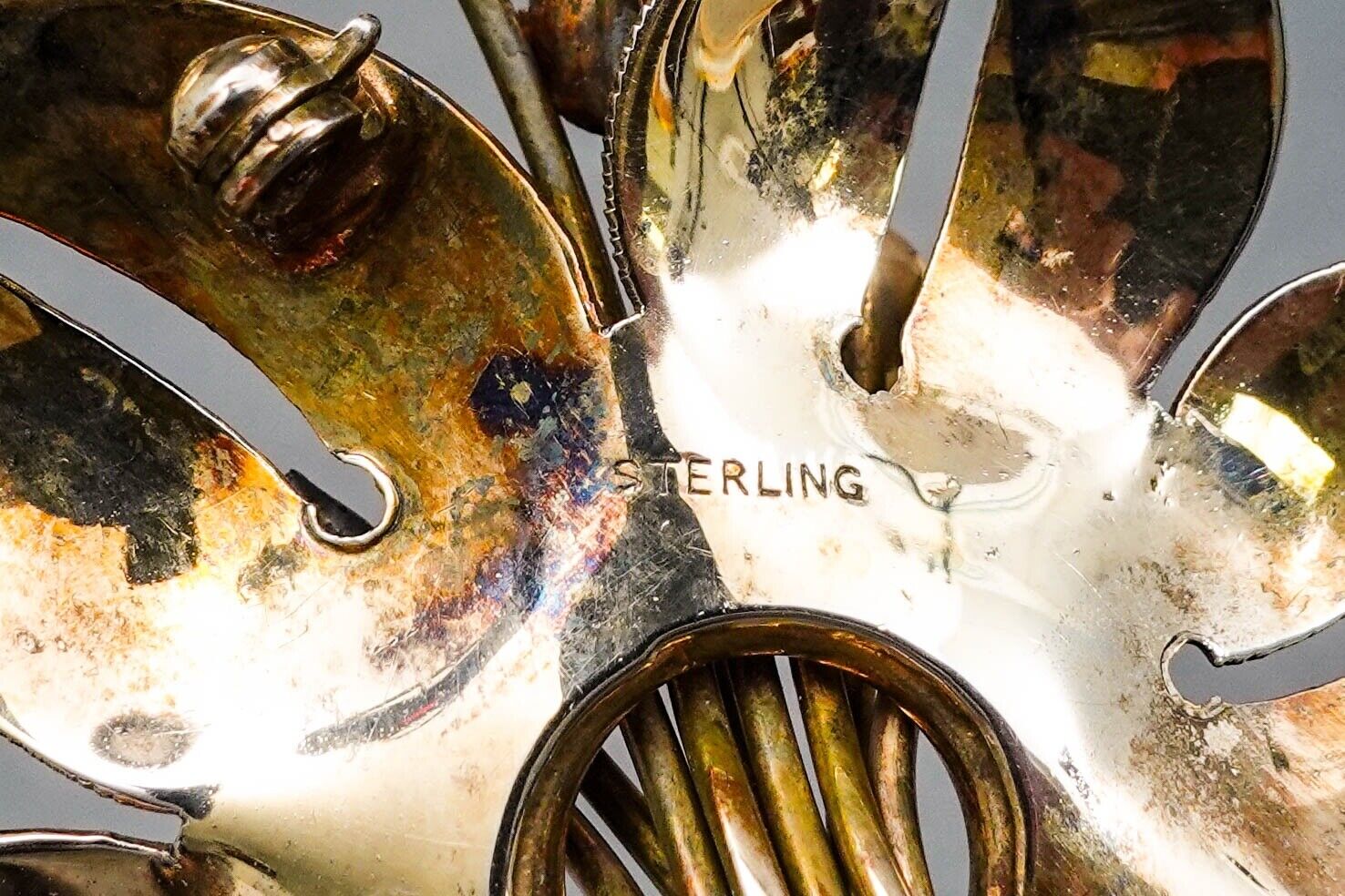 Vintage Large Sterling Silver Faux Pearl Amber Rhinestone Bouquet Brooch Pin.Measures approximately 4" long, 2 1/2" wide. Weight 34 Grams.Great pre-owned condition. Item is being sold as found.Some patina. Overall fantastic appearance!!!